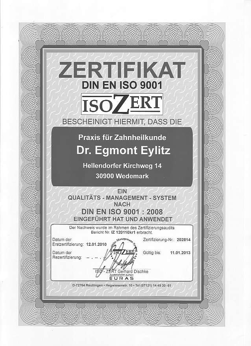 Diese Zertifizierung garantiert dem Patienten, dass wir zahnmedizinische Behandlungen, Hygieneansprüche und alle sonstigen Arbeitsabläufe in der Praxis gemäß des vorgeschriebenen Qualitätsmanagementsystems erfüllen. Organisation und Umsetzung in der Praxis wurden optimiert, Fehlerquellen ausgeschaltet und alle Leistungen konsequent auf die Bedürfnisse unserer Patienten ausgerichtet. Daraus resultieren ein top duchstrukturiert arbeitendes Team mit sehr gutem Arbeitsklima und letztlich zufriedenen Patienten.